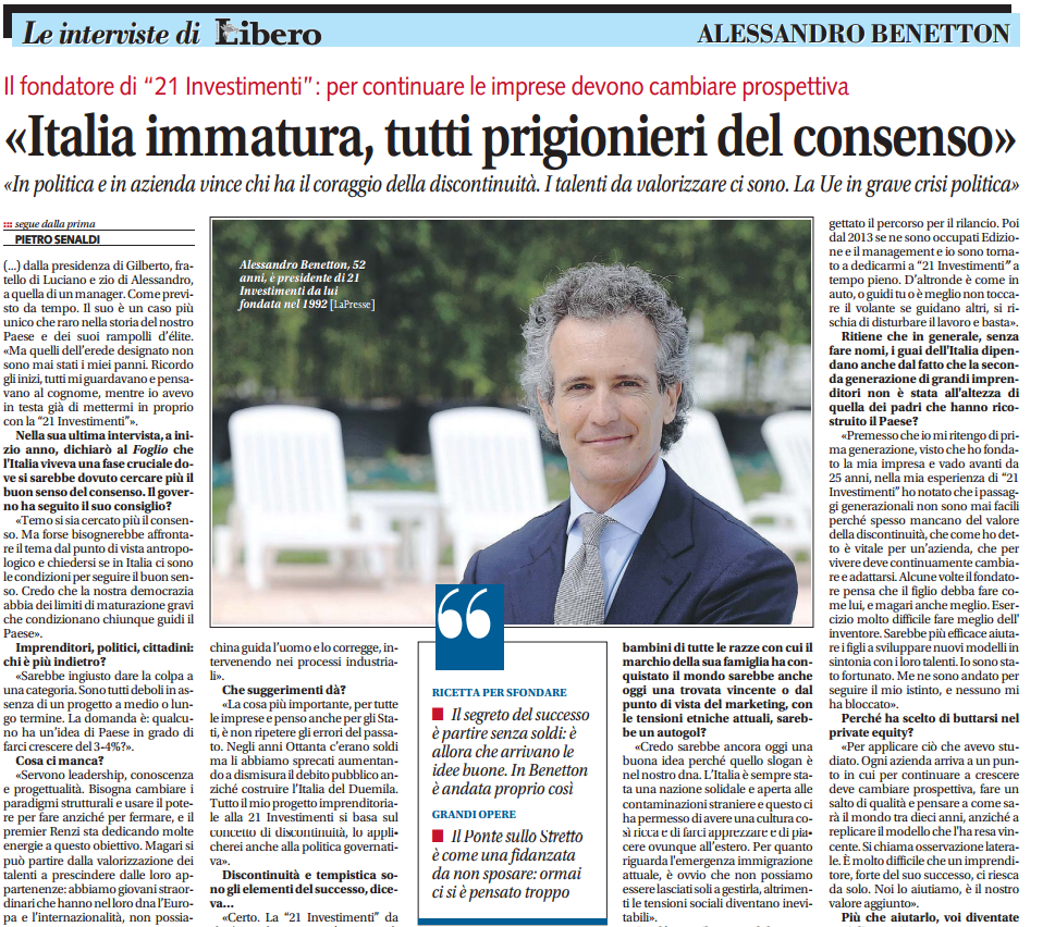 In un dialogo con Pietro Senaldi, Direttore Responsabile di Libero, parlo del nostro Paese e di «lateralità», «coraggio», «tempi giusti» e «discontinuità», i quattro punti cardinali della mia vita.